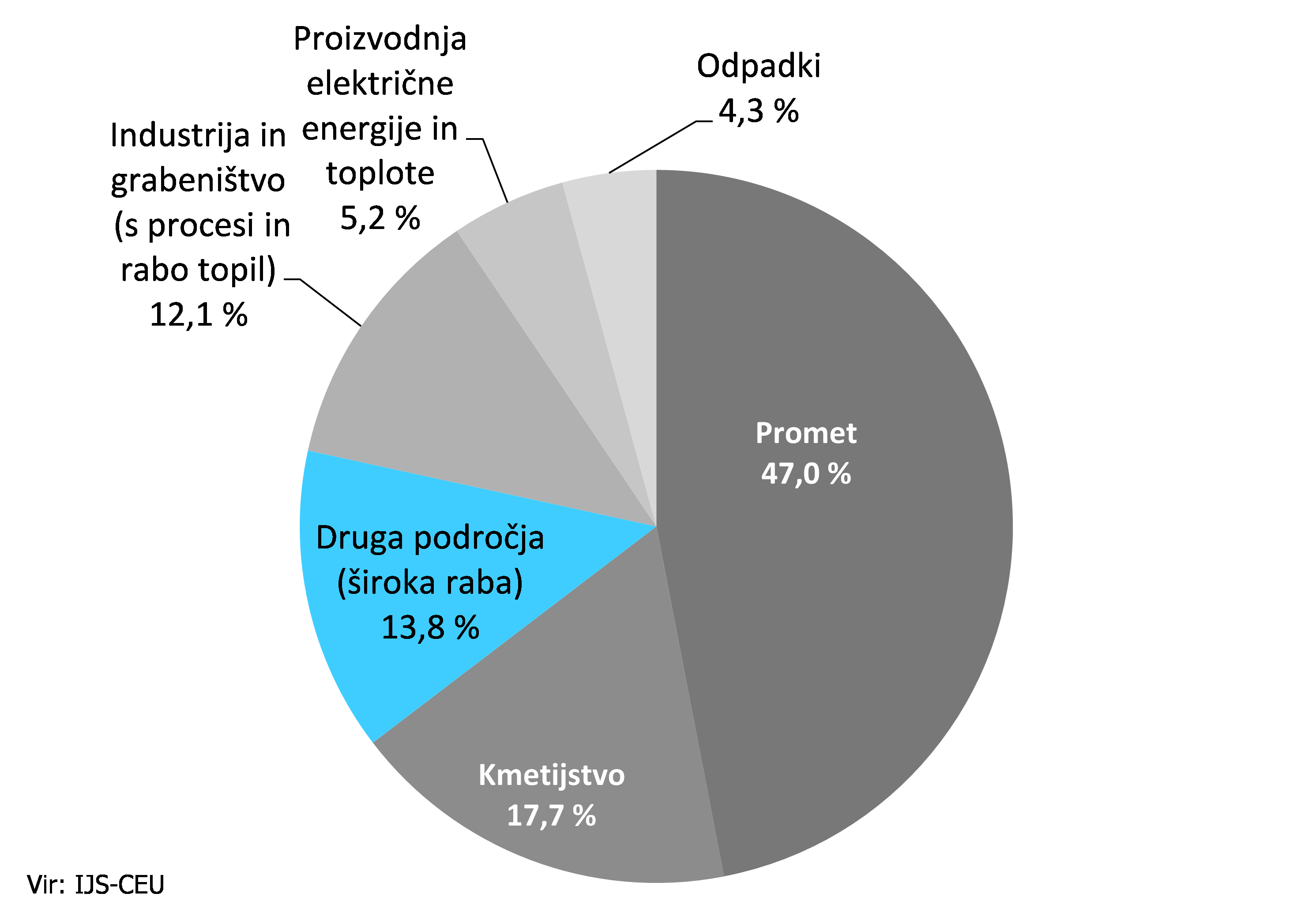 Raba goriv v široki rabi (v gospodinjstvih, kmetijstvu − samo kmetijska mehanizacija in storitvenih dejavnostih) je v letu 2020 k emisijam neETS prispevala 13,8 %. Ta delež se je od leta 2005 zmanjšal za 9,3 odstotnih točk, od leta 2011 pa za 4,2 odstotne točke. Glede na leto 2019 so se emisije povečale za 0,1 %. V obdobju 2005−2020 so se emisije v široki rabi zmanjšale najbolj med vsemi sektorji, in sicer za 50,3 % oz. za 1.359 kt CO2 ekv, kar je posledica naložb v izboljšanje toplotne izolacije stavb in drugih ukrepov učinkovite rabe energije ter tudi zamenjave kurilnega olja z nizkoogljičnimi viri energije.