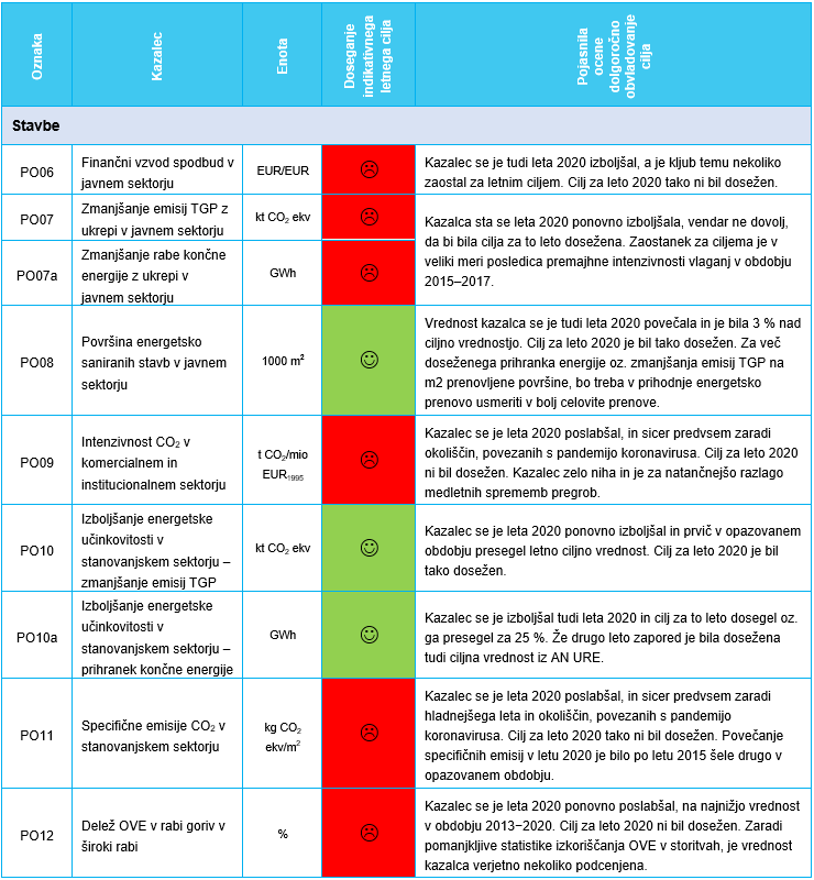 V emisije na področju stavb so vključene emisije iz rabe goriv v gospodinjstvih s 7,9-odstotnim deležem v skupnih emisijah TGP po Odločbi 406/2009/ES in emisije iz rabe goriv v institucionalnem in komercialnem sektorju s 3,4-odstotnim deležem v letu 2020. Skupaj so stavbe torej predstavljale 11,3 % vseh emisij neETS. Večina emisij nastaja pri rabi goriv za ogrevanje stavb, zato so emisije v posameznem letu odvisne tudi od podnebnih razmer. V letih 2015 in 2016 je v stavbah sicer prišlo do povečanja emisij za skupaj 15,6 %, v letih 2017 in 2018 pa so se emisije ponovno znatno zmanjšale (za 9,9 % oz. 10 % v primerjavi z letom prej) in v letih 2019 in 2020 pa so ostale skoraj nespremenjene v primerjavi z letom 2018. Da bi lahko dosegli ambiciozno zastavljene sektorske cilje do leta 2030, bo potrebno v stavbah zagotoviti kontinuiteto izvajanja in intenziviranje ukrepov.