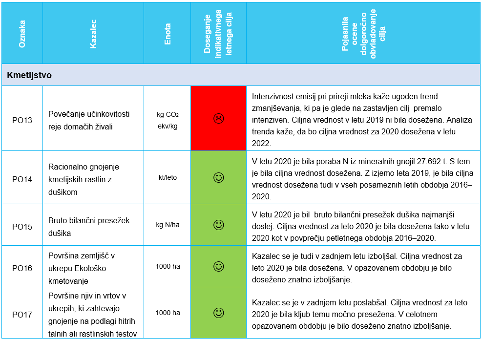 Emisije TGP v IPCC sektorju kmetijstvo so leta 2020 predstavljale 17,7 % v skupnih emisijah TGP po Odločbi 406/2009/ES (9,7 % fermentacija v prebavilih, 3,2 % ravnanje z gnojem, 4,8 % kmetijska zemljišča) in so bile po deležu drugi sektor za prometom. Po letu 2005 smo sprva zabeležili dvoletno rast, do leta 2013 je sledilo obdobje zmanjševanja emisij, zatem do leta 2016 triletna rast. Po letu 2016 so se emisije ponovno nekoliko zmanjšale. V letu 2020 so emisije znašale 1.724 kt CO2 ekv, kar je na ravni izhodiščne vrednosti v letu 2005 (indeks 1,00) in za 5,0 odstotnih točk manj od ciljne vrednosti za leto 2020.
