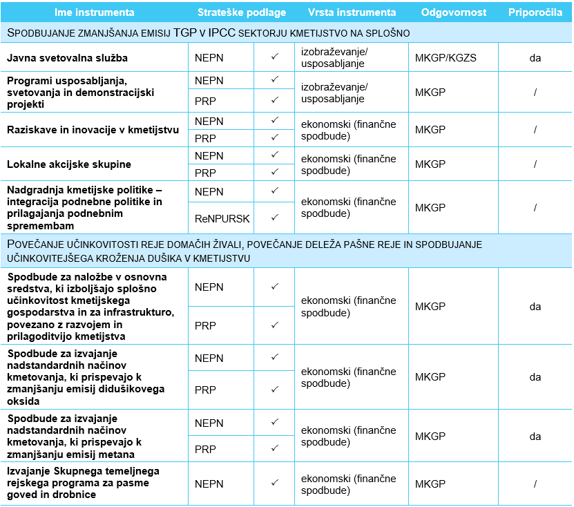 Podrobnosti o izvajanju instrumentov za zmanjšanje emisij TGP v sektorju kmetijstvo so predstavljene v kataloških zapisih.