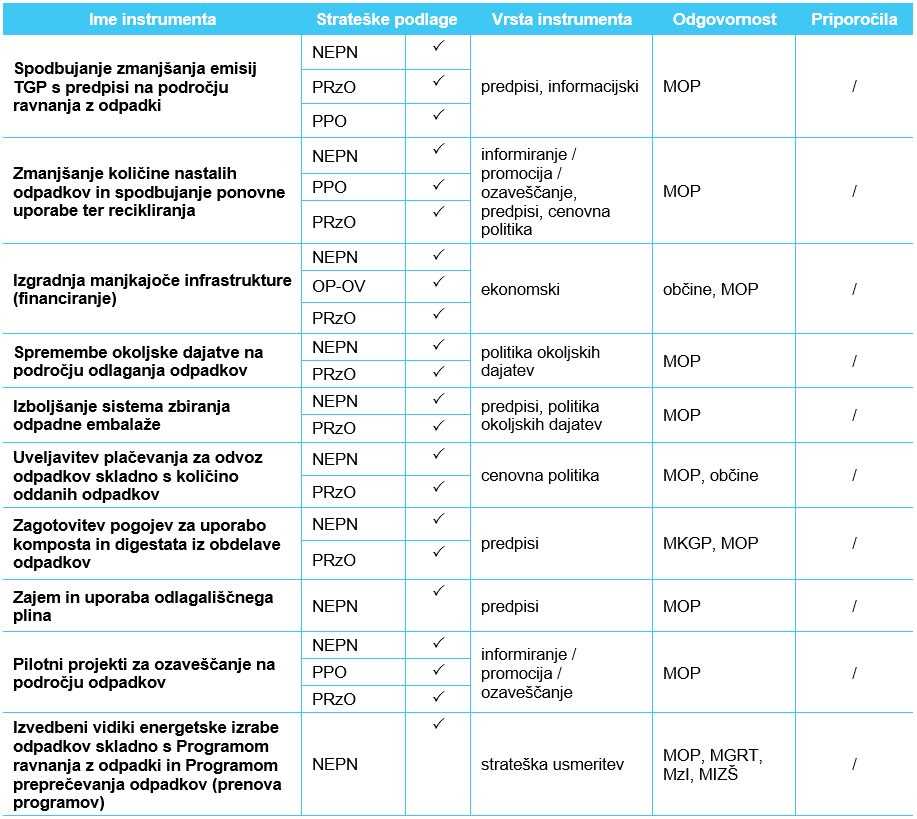Podrobnosti o izvajanju instrumentov za zmanjšanje emisij TGP v sektorju odpadki so predstavljene v kataloških zapisih.