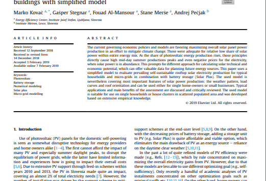 Citation: KOVAČ, Marko, STEGNAR, Gašper, AL-MANSOUR, Fouad, MERŠE, Stane, PEČJAK, Andrej. Assessing solar potential and battery instalment for self-sufficient buildings with simplified model. Energy. 2019, vol. 173, str. 1182-1195. ISSN 0360-5442. DOI: 10.1016/j.energy.2019.02.024.