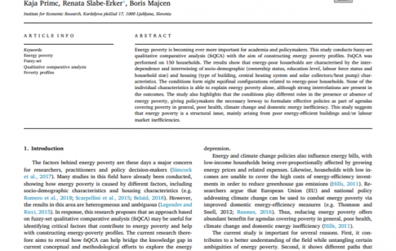 Abstract: /…/ This study conducts fuzzy-set qualitative comparative analysis (fsQCA) with the aim of constructing energy poverty profiles. FsQCA was performed on 150 households. The results show that energy-poor households are characterised by the interdependence and intertwining of socio-demographic (ownership status, education level, labour force status and household size) and housing (type of building, central heating system and solar collectors/heat pump) characteristics. /…/