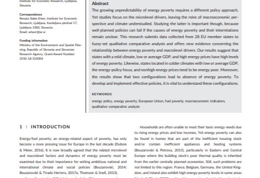 Abstract: The growing unpredictability of energy poverty requires a different policy approach. Yet studies focus on the microlevel drivers, leaving the roles of macroeconomic perspective and climate understudied. Studying the latter is important though, because well-planned policies can fail if the causes of energy poverty and their interrelations remain unclear. /…/